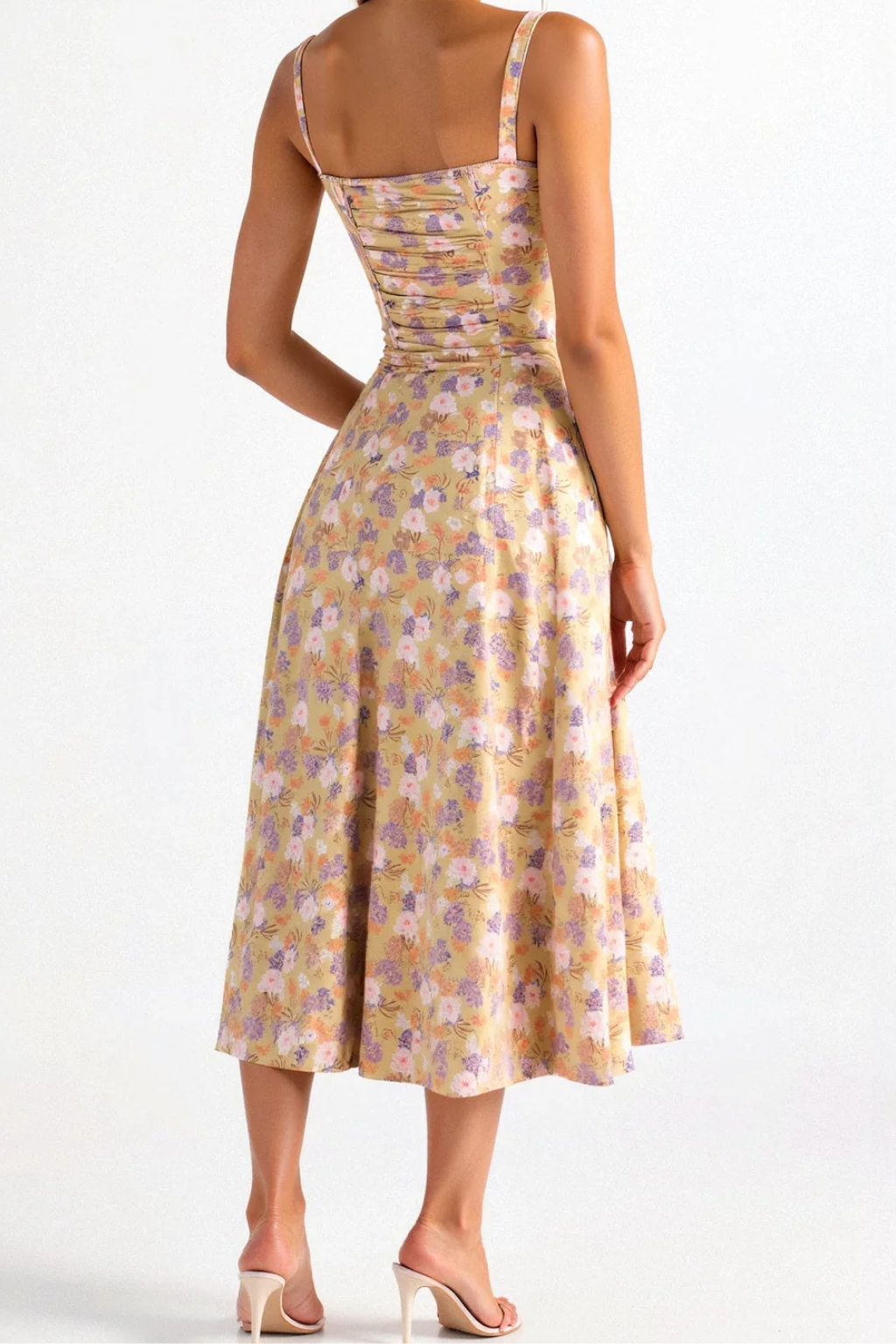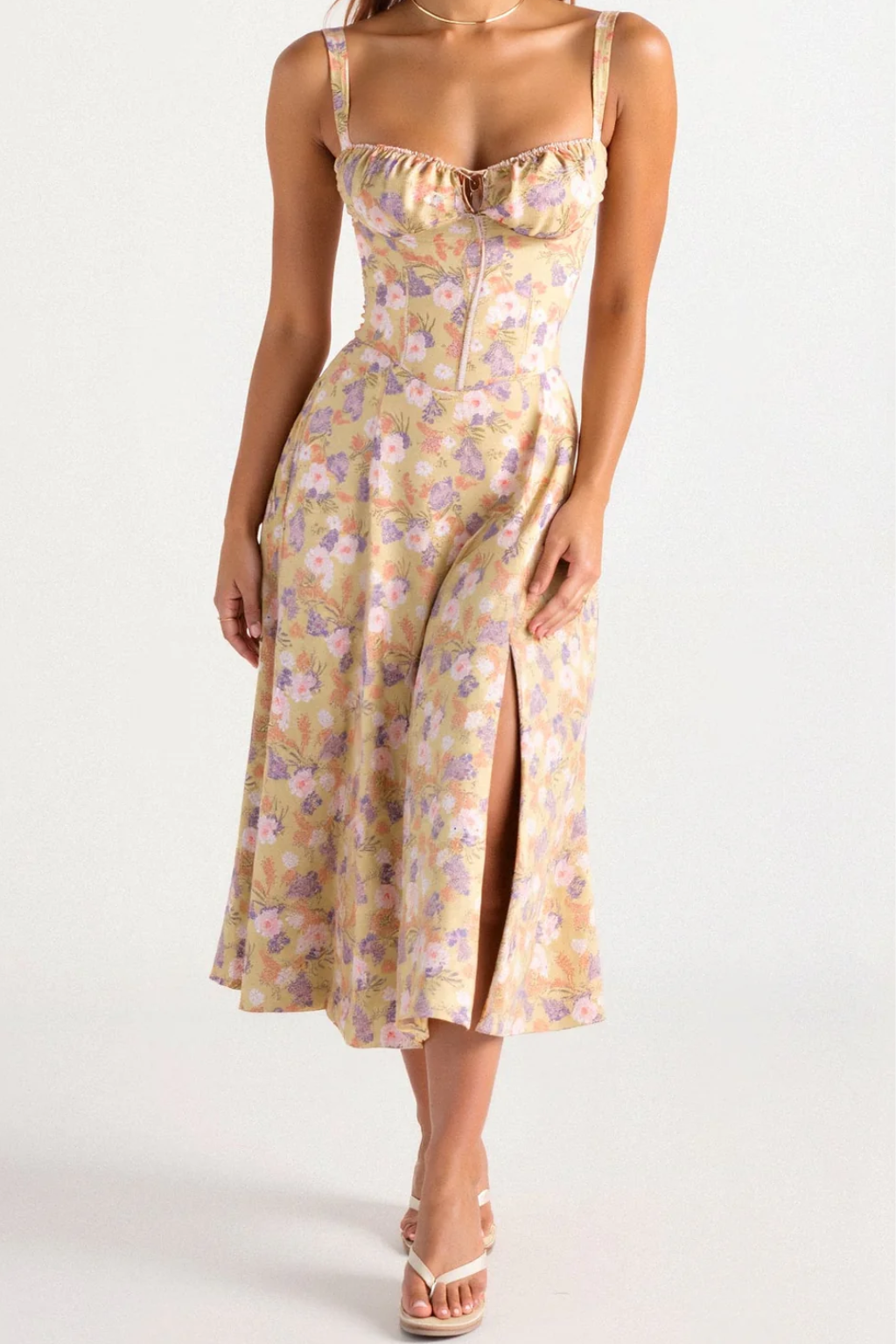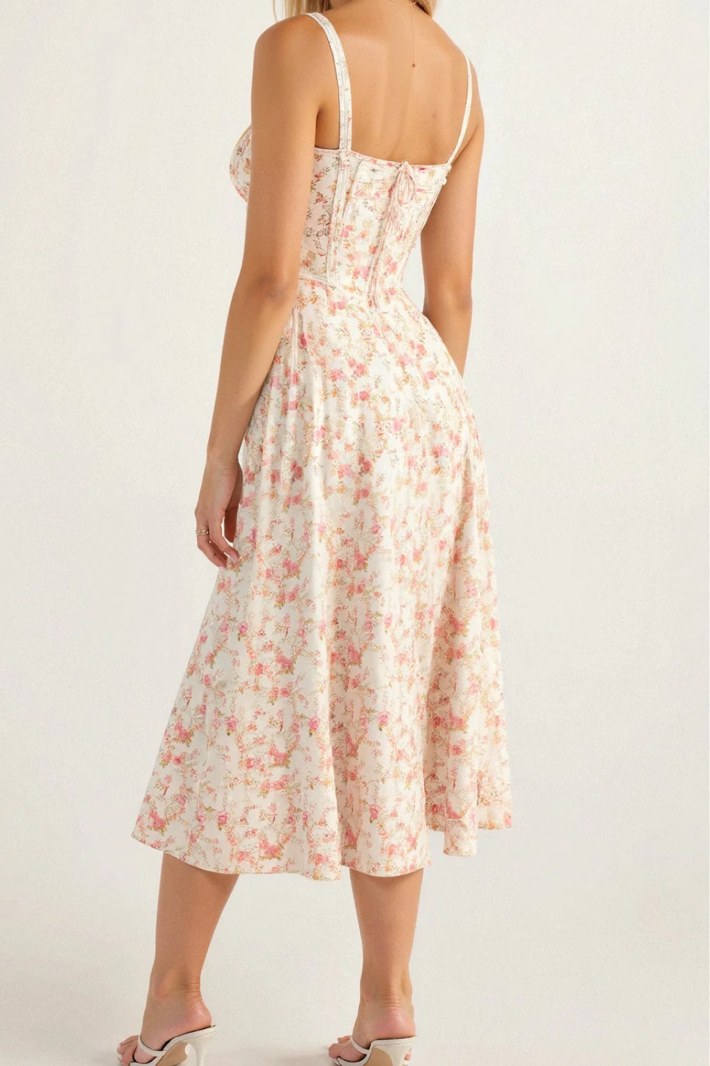 Diseñado con finos tirantes tipo spaghetti y un escote cuadrado, enmarca la parte superior del cuerpo mientras mantiene una sensación ligera. La parte superior estilo corsé define la cintura, mientras que la falda fluida y una sutil abertura lateral aportan movimiento en cada paso. Perfecto para días cálidos, salidas por la noche o para el día a día cuando quieres algo que destaque sin esfuerzo.
