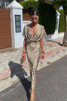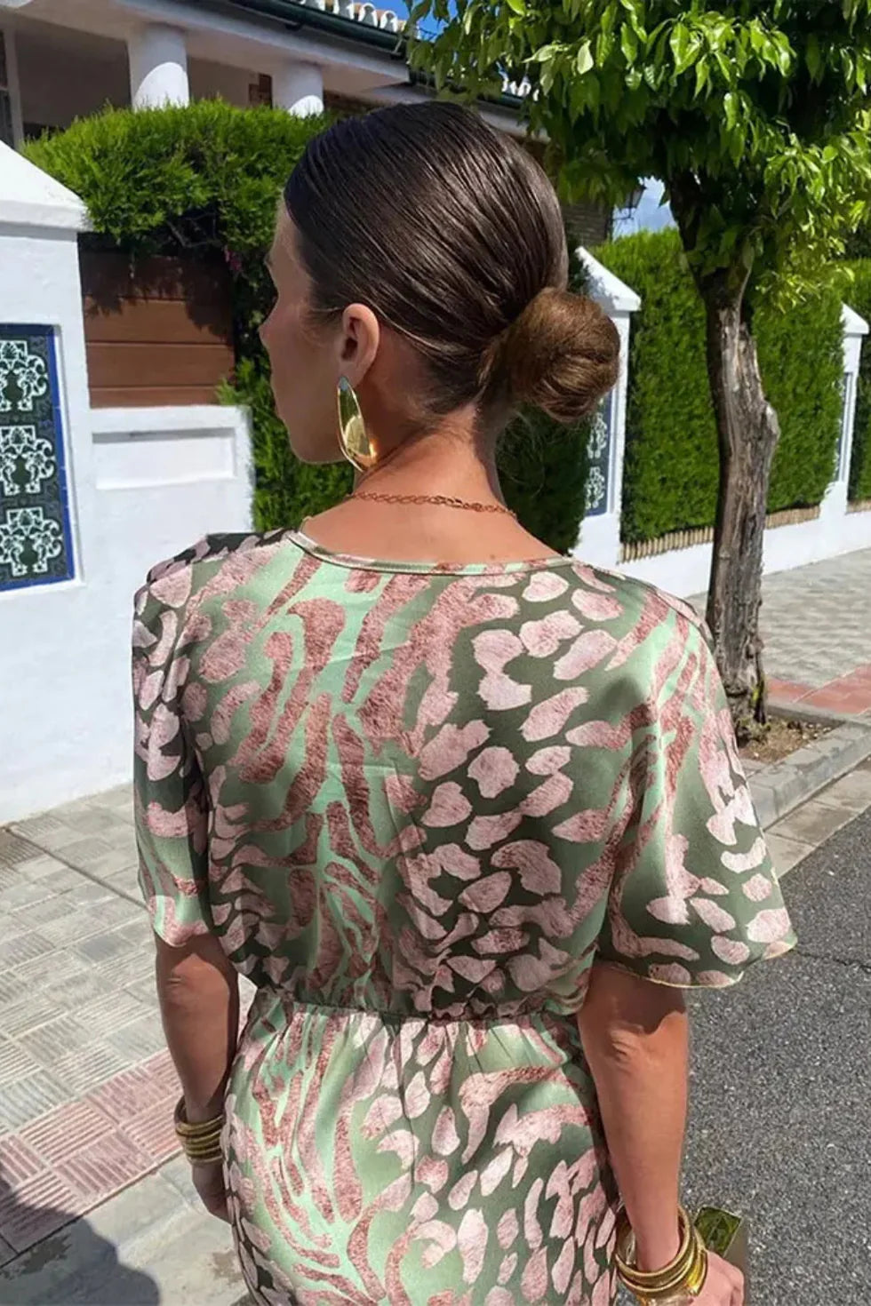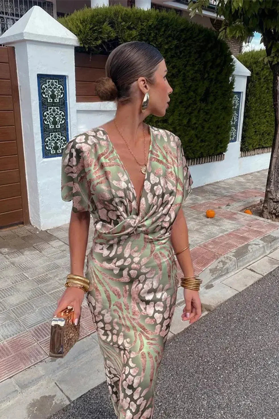 El estampado y el detalle frontal cruzado le dan a este vestido un estilo llamativo y con forma definida, mientras que el escote en V realza la silueta con un toque favorecedor. Es una pieza que destaca de manera natural con una estética moderna y segura.
