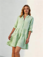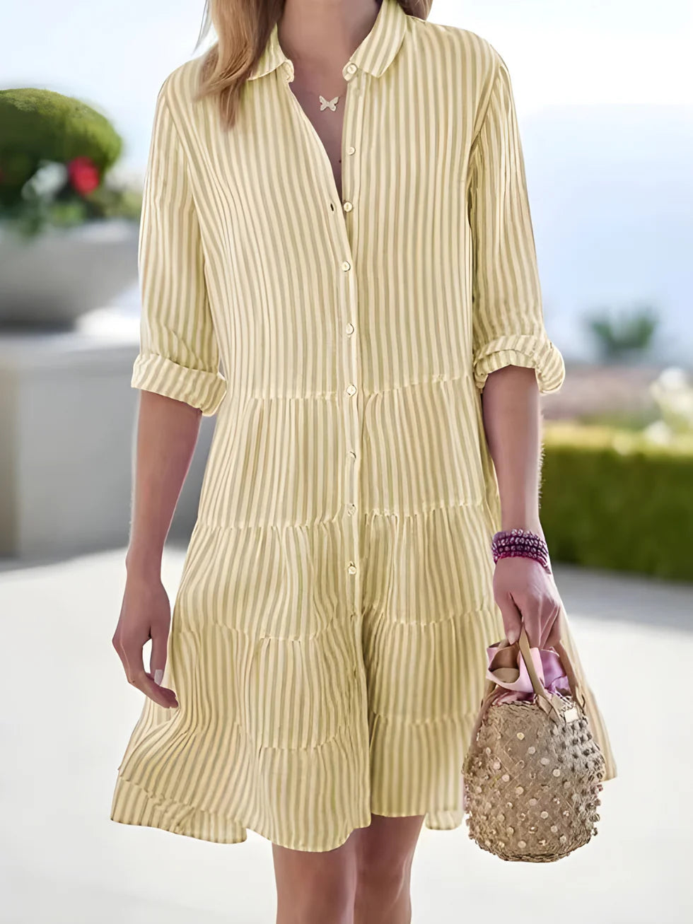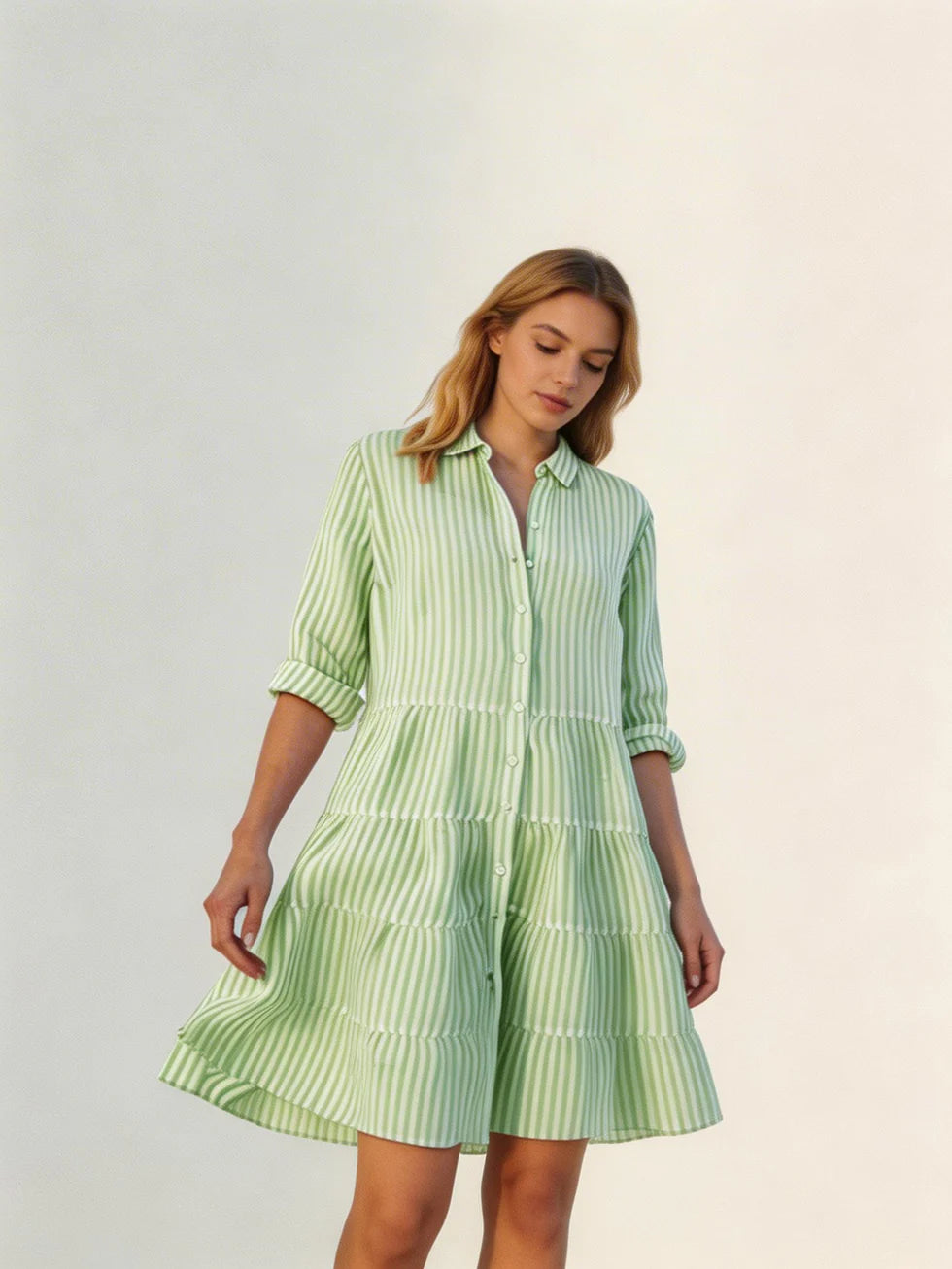 Un diseño ligero y dinámico define este vestido mini, con un patrón de rayas verticales que crea una sensación de longitud y movimiento. Los botones frontales y el corte en capas aportan estructura visual, mientras que la silueta fluida mantiene un look relajado y fácil de llevar.